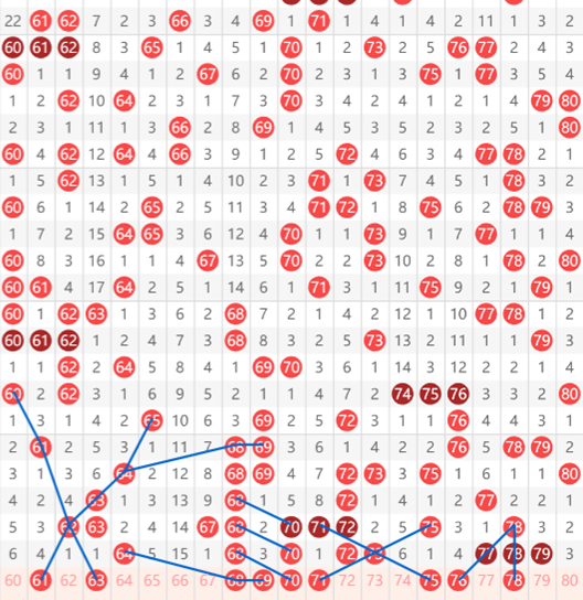 快乐8第2025281期61-80区域的推荐如上图,这个区域我们首先看61号,从65间隔一期出64.63.62的斜连,然后再间隔一期出61的对称斜连走势。然后就是63号,我们看到是同样的,从60间隔一开出62,再间隔两期出63的走势。那么下来68~71这个位置号码比较集中,其中68.70.71都有开出的可能,特别是68和70之间的斜连关系,然后就是75号,一个隐藏的号码从71到73再到75的间隔斜连,最后是76和78,他们形成了一个三角的走势。76是一个78~76的三斜连走势,而78考虑走重。具体请根据个人思路觉得决定