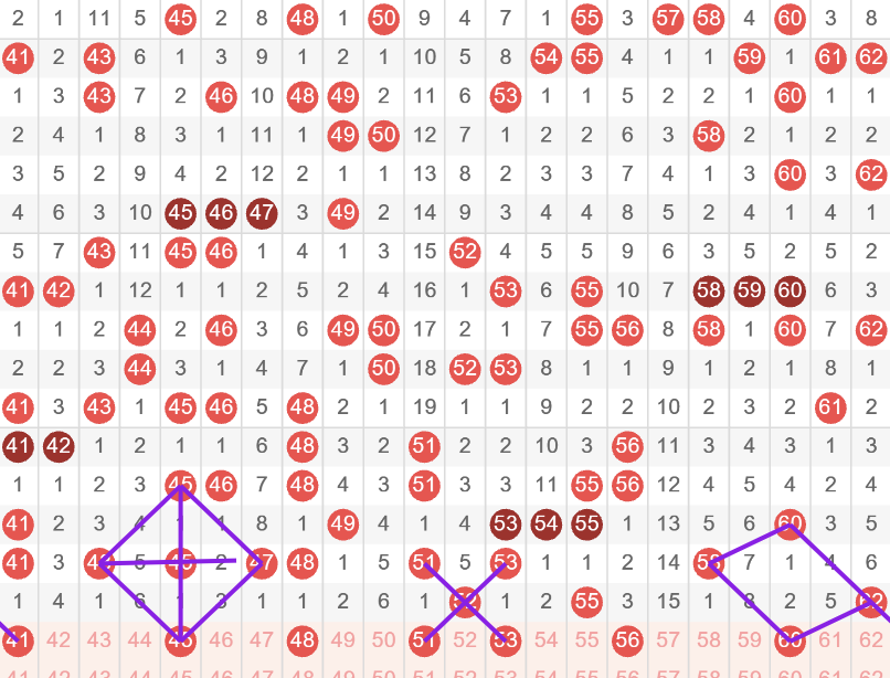 45这是一个中心对称的号,看好的直接取一码当胆;41 45看的是选一的位置非常稳,也有一点机会开出45 46二码组合,51 53是一个非常对称的菱形形态,57的冷号回补今天值得关注,56 57很有可能开出一码,今天4头看组合号;56 60有机会开出一到两码组合值得关注;55的座号是有机会开出的;