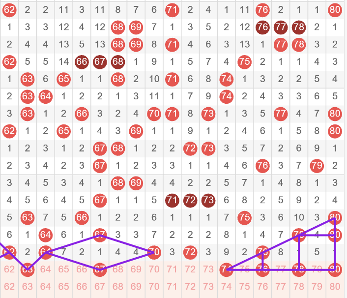 63 67是二选一的点位,这种热形态,也有小概率开出63 64二码,是往期热组合;67 68这里是一个二选一的点位,74今天是跳空号这个点位非常不错,75 76这里选择做一到二码;76 78 80有机会开出组合的点位,80有机会当凤尾;