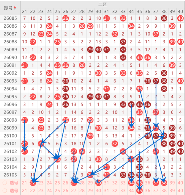 二区在近期区间的走势上分析,而且整个区间现在是一个温热形态,上期二区间开出了6码,而且整个区间上期开出的形态是重码假六连和斜连号下拉走势,上期小妹在文章中布局到了3码,那么本期二区间重点关注的形态是空位回补,对称形态,重码走势,那么本期首先注意空位回补上的22.23.24.26.中选择1-2码回补机会,而对称形态上的30.34.37.中选择1-2码开出机会,至于重码走势上注意31.34.35中参考1-2码走重机会,上期重点关注在重码回补上布局到了1码开出,那么本期重点关注在空位回补上布局一码订胆机会,如图所示.