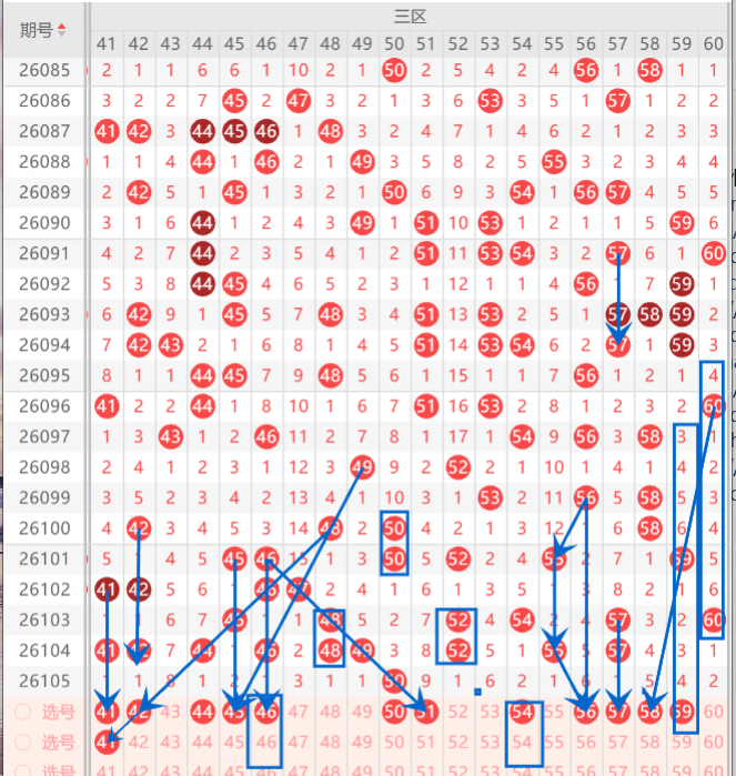 而三区的打底号.41.44.46.50.51.52.54.57.56.中参考3-4码开出机会,