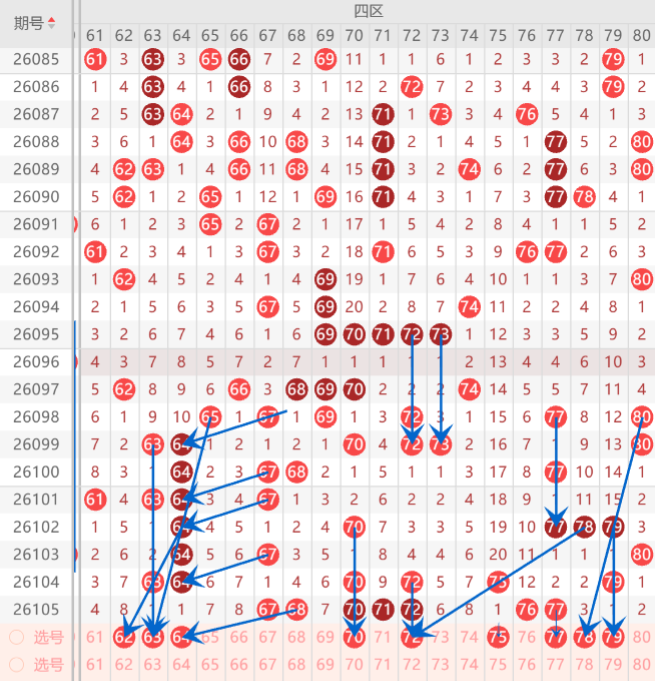四区间关注的打底是62.63.67.70.72.75.77.78.79中参考3-4码开出机会
