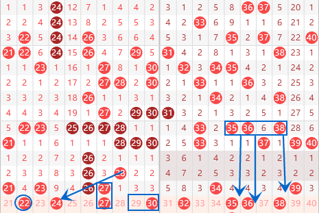 上期开出了21 27号数字,那么1路号码中就只有24号数字没有开出来了,我们可以关注一下24号数字的出号情况。本期我们也是要注意27号数字走重的可能,如果27走重,那么24号数字开出的可能性就很小了。本期的连号28 29 30我们要注意落号情况了,上期没能落号下来,本期机会就很大了。连号空一带号35 36 37已经遗漏4期没能落号了,本期我们我们要重点考虑,在这里可以定一胆码出来的。