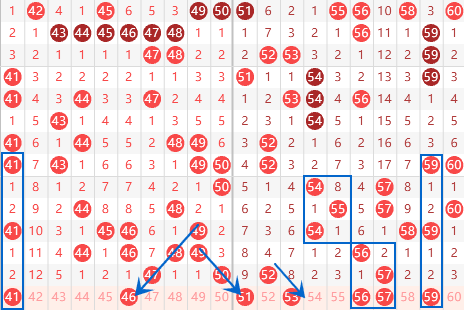 该区间的46号数字我们要注意一下,防守它回首掏的可能性。51号数字是属于夹号,又是遗漏9期的号码,本期的夹号有5个,遗漏9期的号码有3个,所以出号机会还是比较大的。56号数字我们可以关注一下,如果56号数字不出,那么57号走重的机会就大了。