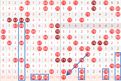 连号67 68已经遗漏4期了,本期应该是要落号了,我们可以关注一下。69 71 72 74形成了3连空一出号,那么我们可以注意一下出一重号一夹号的情况,重点关注71 74走重,夹号关注70号数字的出号情况。