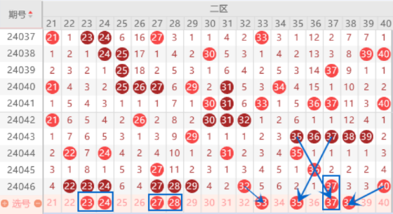 上期开出了22 23 24的连号和27 28 29号数字的连号,本期我们注意一下出重号的情况,重点关注一下23 24 28 29号数字出重号的情况,这里是有机会出两个重号的。上期开出了32号数字,本期我们注意一下把33号数字带出来的情况。本期的35 37号数字是属于交叉对称号码,本期我们注意出一个号码的情况,可以重点关注一下35号数字出号情况。本期的38号数字我们可以做一下防守。