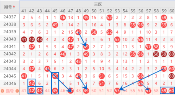 本期的42号数字我们注意一下走重的情况,如果本期的42号数字不走重,那么我们就注意一下32号数字出重的情况了。本期的43号数字是属于空6对称号码,而且43 46 49 50号数字是属于0路号码,已经遗漏4期没有出号了,本期我们要注意出号情况了。上期开出了51 56号数字的重号,那么本期的52 53 54 55号数字我们就要注意出号情况,重点关注一下52 53好好苏子出号情况就行了。本期的59 60号数字我们注意同出的情况,可以做一下防守。