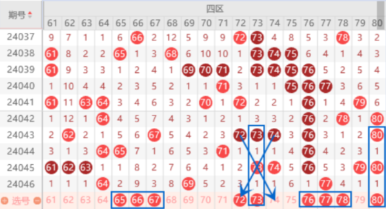 该区间的连号60 61 62 63号数字上期没能出重号,本期我们注意一下回补一个号码的情况,重点关注一下60 61号数字的出号情况就行了。本期的65号数字我们注意一下出号情况,属于三斜连号码,出号机会还是有的。本期的67号数字我们注意一下出号情况,61 64 67号数字的V型号码,出号机会还是有的。本期的72 74号数字我们注意一下出号情况,属于交叉对称号码,可以重点关注一下72号数字的出号情况。本期的76 77号数字注意一下出号情况,77号数字可以重点关注一下。