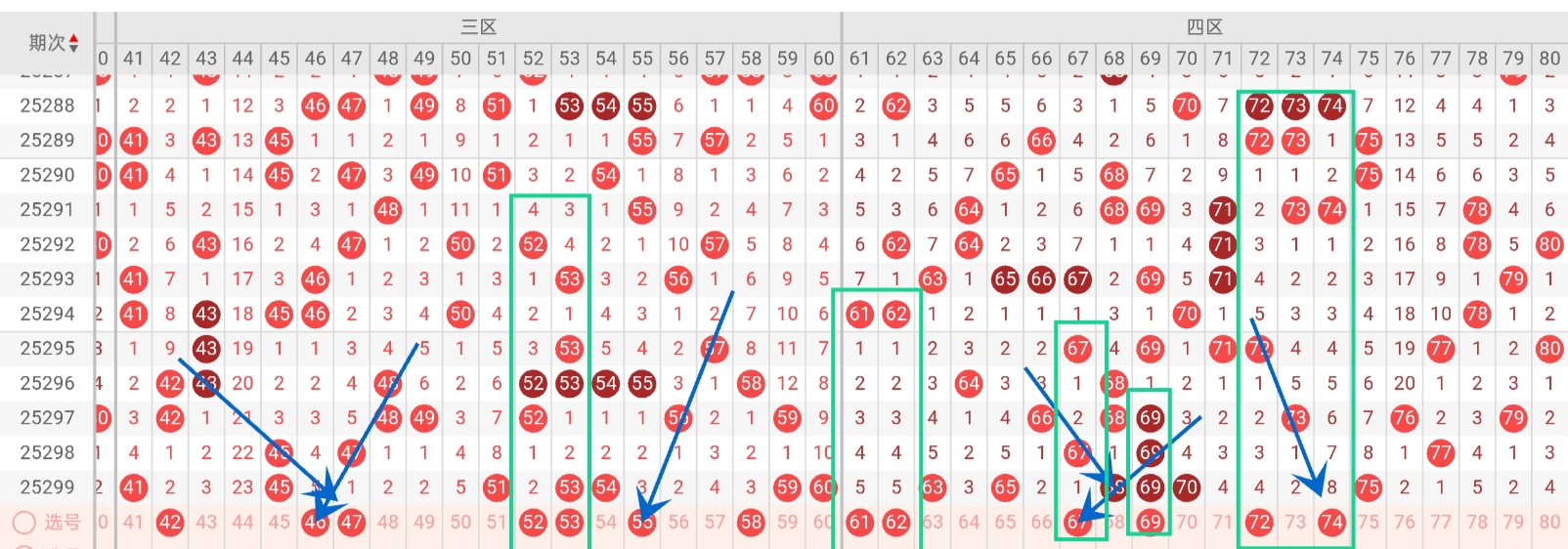 四区间上期开出63-65-68-69-70-75, 共6个号码,本期大家可以根据尾数、隔期码、以及边码走势情况,本期首先需看67相邻码、69会再出现;上期70-75区间未开出号,本期出号74机会比较大,本期四区有连续号61-62预测会出,上期龙头63,凤尾75,本期预测龙头61、凤尾74,本四区间建议大家关注号码74会出,再根据号码走势预防连续号61-62出现。综合分析筛选,本期四区推荐:61-62-67-69-72-74