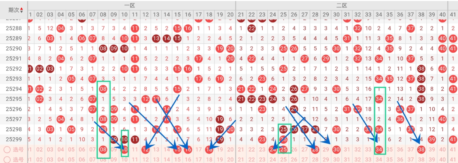 第2025300期福彩快乐8通过以下走势图及一二区间预测分析如下: