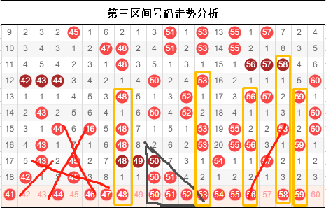 第三区间号码41-60,如果说这一期哪个区间是重点,无疑三区是这一期的王。走势上百花齐放,万码呈现。如果对于有密集恐惧症和选择综合症的人来说这一期就犯难了,真的不知道如何下手了。前面我们讲这一期应该是一个图形为王的好时候,就看能不能抓到了。如果你还没有合适的择号,不妨参照我们今天给出的号码。