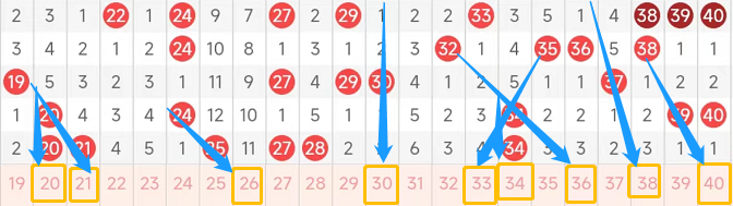 第二区间号码21-40,本区经历前面的六连号之后也是断断续续开出两连号,除此再无更好的业绩出现,热度依然在悄悄降低。均线分析号码有26,40,25,21.