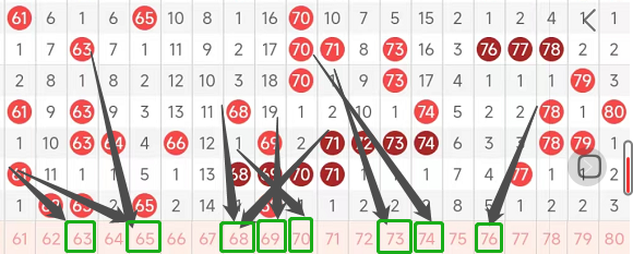 第四区间号码61-80,本区目前有点模糊,到底是走出了热度还是褪去了热度,尚看不明确,尤其是70-80一个号码都没有,这并不代表进入冷门,依据如此复杂的走势,应该还有一波操作猜对才对。均线分析号码有64,74,66,62。
