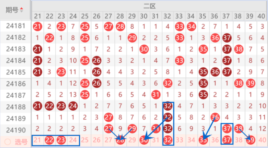 四连号21 22 23 24号数字上期没能开出号码,那么本期我们就要注意落下一个号码的情况,其中的23号数字我们需要重点关注一下,出号机会很大。上期开出了27 29 31 32号数字,那么本期这里我们要注意出一个重号和夹号的情况了,夹号重点关注一下28号数字的出号情况,重号重点关注一下29 32号数字出一个号码的情况。本期的35号数字我们关注一下出号情况,只能做防守。上期开出了37 38号数字的连号,本期我们注意一下出一个重号的情况。本期的39号数字我们注意一下出号情况,上期本该出的,没出,本期是有机会出了。