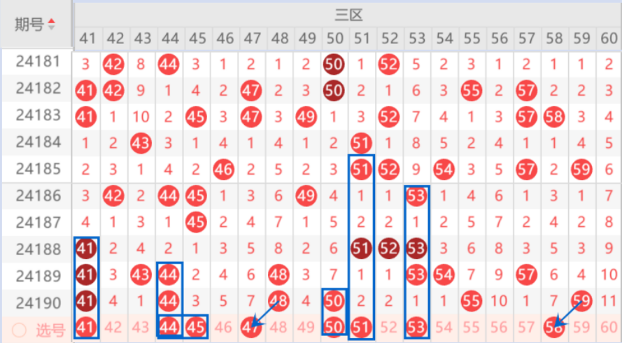 该区间上期的41 44号数字开出了重号,那么本期我们还是要注意有一个继续出重的情况。本期的45 46号数字我们注意一下出一个号码的情况,其重点的45号数字可以重点关注一下。本期的50号数字我们注意一下出重的情况,这里可以防守一下50 51号数字同出的情况。本期的51 52 53号数字出一个号码是没有问题的,都是属于对称号码,重点关注一下51 53号数字出一个号码的情况。上期开出了59号数字,那么本期的58号数字我们就要注意了,出号机会很大。