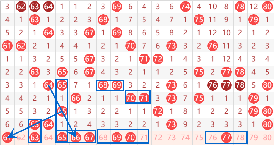 本期我们注意一下61 62号数字落号的情况,其中的61号数字可以重点关注一下,出号机会很大,这里可以防守一下61 63号数字同出的情况。本期的63号数字属于斜四连号,出号机会也是有的。本期的66号数字我们可以重点关注一下,属于三斜号码,而且这组三斜连号码出号还是比较频繁的,我们需要注意一下。本期的阶梯号码68 69 70 71号数字哦我们要注意出号情况了,这里可以关注一下69 70号数字同出的情况。三连号76 77 78号数字我们也是要注意出一个号码的情况的,其中的77号数字可以关注一下。