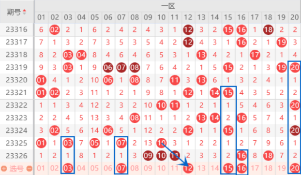 该区间上期的01 03 05 07号数字都没有出重,是直接断号了,那么本期我们就要注意一下回补的情况了,重点关注一下03 07号数字的出号情况。上期开出了两组三连号,本期有一组有可能要断号,本期的09 10 11有可能断号,所以本期这里我们就放弃了。上期的中心对称号码14 16号数字开出了16号数字,本期我们要注意一下出重的情况,防守一下15 16号数字同出的情况。本期的20号数字是属于212走势,我们可以关注一下。