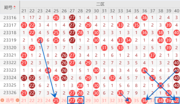 该区间的26号数字本期应该是出不来了,我们关注一下25 27号数字的出号情况,这里应该有机会出一个号码的。上期开出了连号空一带号27 28 30号数字,本期我们要注意一下出重的情况,重点关注一下27 28号数字出一个重号的情况。上期开出了33号数字,本期我们要注意一下分边的情况,重点关注一下34号数字的出号情况。本期的36 40号数字是属于交叉对称号码,我们要注意出一个号码的情况。