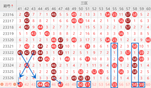 本期的41 44 47号数字我们要注意了,属于1路号码,在该区间的1路号码已经断号3期了,本期应该是要出号了。上期开出了49 50 51号数字的三连号,本期我们要注意出重号的情况,重点关注一下50 51号数字出重的情况。本期的55号数字我们关注一下,做一下防守就行了。本期的57 58 59号数字应该是要出号了,我们重点关注一下58 59号数字的出号情况就行了。