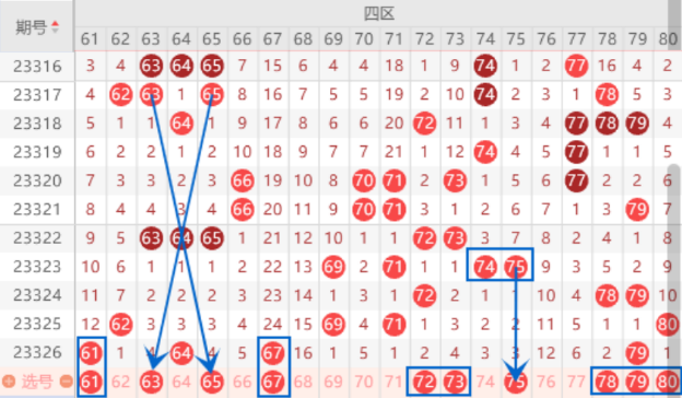 该区间上期开出了61 64 67号数字,本期我们注意出一个重号的情况,重点关注一下61 67号数字出重的情况。本期的63 65号数字是属于镜像对称号码,我们要注意同出的情况了。本期的72号数字我们关注一下,属于312乱序走势,出号机会还是有的,连号74 75本期应该是要落号了,本期我们要注意一下。上期开出了79号数字,本期我们要注意一下78 80号数字的出号情况,这里有可能走分边的情况。