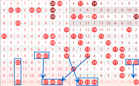 上期该区间只出了1个号码,本期应该会回升一下,在该区间有4个冷号,个人思路是把02 04 05做防守,主做09号数字,下几期在回过头来做02 04 05,所本期我们可以关注一下03号数字的出号情况。连号06 07已经遗漏3期了,本期我们要关注一下它们的落号情况。12号数字和10 11形成了3斜连,本期可以关注一下。上期开出18的重号,而且57也开出来了,那么本期的20号数字我们就就要关注一下了。