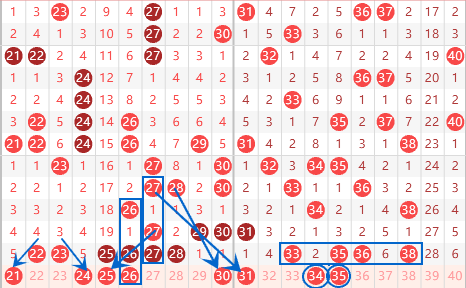 该区间上期开出了4连号25 26 27 28,那么本期我们就要注意落重号的情况,重点关注25 26号数字走重的情况。24号是属于夹号类型,本期的夹号有点多,我们可以关注一下。三连号29 30 31上期没能落下号码来,本期我们要重点关注一下它落号的情况。上期开出了33 35 36 38号这种类型,那么本期我们也是要注意出一重一夹号的情况的。