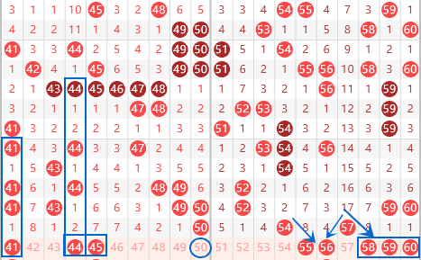本期的41号数字是属于空一对称,可以关注一下。44号是属于212走势,可以注意一下44 45同出的情况。55 58号数字都是属于遗漏8期的号码,本期遗漏8期的号码有4个,开出一个是没有问题的,我们可以重点考虑一下。连号59 60我们也是要注意落号的情况的。