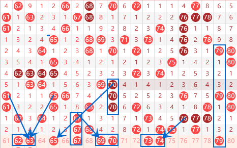 上期的63号数字没能开出来,本期我们在做一期看看,能否落下来。本期的67号数字我们要注意走三重的情况。72 74 75 77这种类型的号码,我们也是要注意开出一重一夹的情况的。本期的79 80号数字我们可以关注一下,有机会开出一个号码来的。