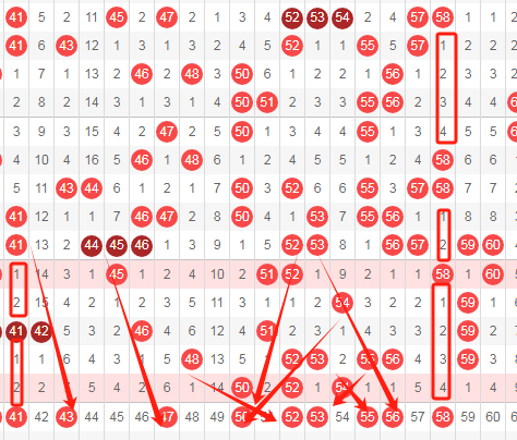 今日五区区号码建议参考41的等期遗漏,建议参考43的隔期斜连,五区后区建议参考47隔期斜连,防50多线走重。今日六区号码建议参考52的偶连重号,防52 53对子开出,六区后区建议参考55的顺位斜连,防55 56对子开出,六区后端建议参考58的等期遗漏。今日五区六区号码41 43 47 50 52 53 55 56 58