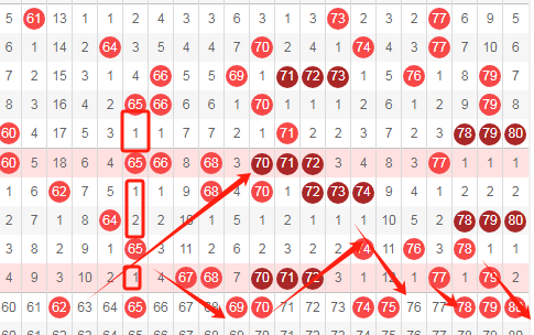 今日七区号码建议参考62同路号斜连,建议参考65遗漏对等,七区后区建议参考69的奇连,防69 70对子号开出,今日八区号码建议参考74隔期空一跳,75的隔期斜连,八区后区建议参考78梅花,80的顺位斜连,防78 79 80连号,今日七区八区推荐号码62 65 69 70 74 75 78 79 80