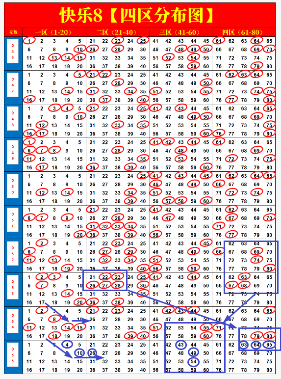 这两期四分图区间的走势画图不是很理想,按照目前我的思路是按照类型图来标记数字。本期还是沿用了这种想法,分别画出了三个部分的号码参考。我个人还是比较看好,第一梯度:04.10.26;其次是43.49.54梯度,最后考虑的是63.64.65梯度组合。综合推荐:04.10.43.49.54