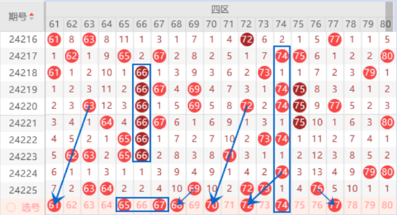 本期的65 66 67号数字是属于重号回补号码,已经遗漏2期没有回补了,本期出现回补的情况是很大的,本期重点关注一下65 67号数字出一个号码的情况,其中的67号数字可以重点关注一下。上期开出了73 76号数字,本期我们注意出一个重号的情况,78 80号数字我们也是要注意出一个号码的情况,以前直播的时候就说过了,这是一组号码,当出了其中的两个的时候,另外两个是要出一个号码的。