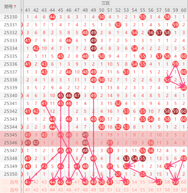 而三区的打底号是41.44.45.46.48.49.51.53.57.59.60中参考3-4码开出机会,