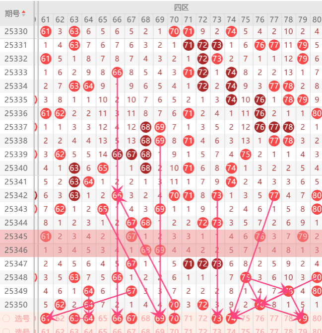 四区间的打底号是61.63.64.66.67.69.70.73.76.79中参考3-4码开出机会