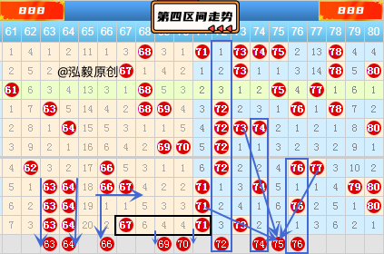 上图中方形状态的63 64号是属于3重号类型,上期的三重号开出了4组之多,回顾历史期数中,只要一期当中同时出现两组三重号的情况下,下一期出四重号的概率是非常大了,所以本期的四重号23 63 64 71也是我们重点照顾对象了。69 70号是属于空三类型的中间数,而且连号69 70已经同事遗漏4期了,在此条件下是不容错过的。72号是属于夹号类型,同时也是4期连续对称类型,本期4期连续对称类型的还有28 53号,但是近两期内这种对称类型的号码没有出过,所以本期我们在考虑对称类型的组合时要慎重考虑,最好是等它出过该种类型的情况下我们在下手最为稳妥。好了,本期分析就到这里了。