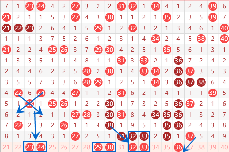 本期的中心对称回补号码22 23 24,我们要注意23 24号数字的回补情况。本期我们要注意一下28 29 30号数字的出号情况,这里出一个号码是没有问题的,重点考虑一下29 30号数字,我们可以在这定一胆码出来的。上期开出了三连号31 32 33.本期我们要注意出重号的情况,重点关注32 33出重的情况。