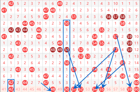 上期开出了42 44,本期我们要注意走重号的情况。上期开出了47号数字的重号,本期我们要注意一下分边的情况,重点考虑一下48号数字的出号情况。本期的52号数字是属于313走势,我们可以关注一下。本期的54也是可以关注一下的,它是属于532走势,这种号码也是经常开出来的。59号数字我们要关注一下,是属于阶梯是号码。按照近期的出号情况来看,本期的三重号我们也是要做号防守的,60号数字我们可以防守一下。