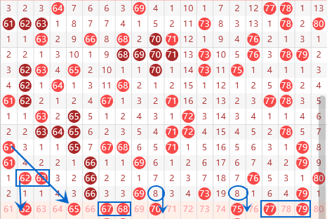该区间的62 63连号,我们要注意落下一个号码的情况。本期的65 67 68我们要注意了,本来上期就应该出号的了,但是没有出,那么本期出号的情况就很大了,我们也是可以在这里定一胆码的。本期遗漏8期的号码我们关注一下70 75的出号情况就可以了。本期的77号数字我们也是要关注一下,它是属于尾数1路号码,已经断了3期了,本期出号机会也是很大的。