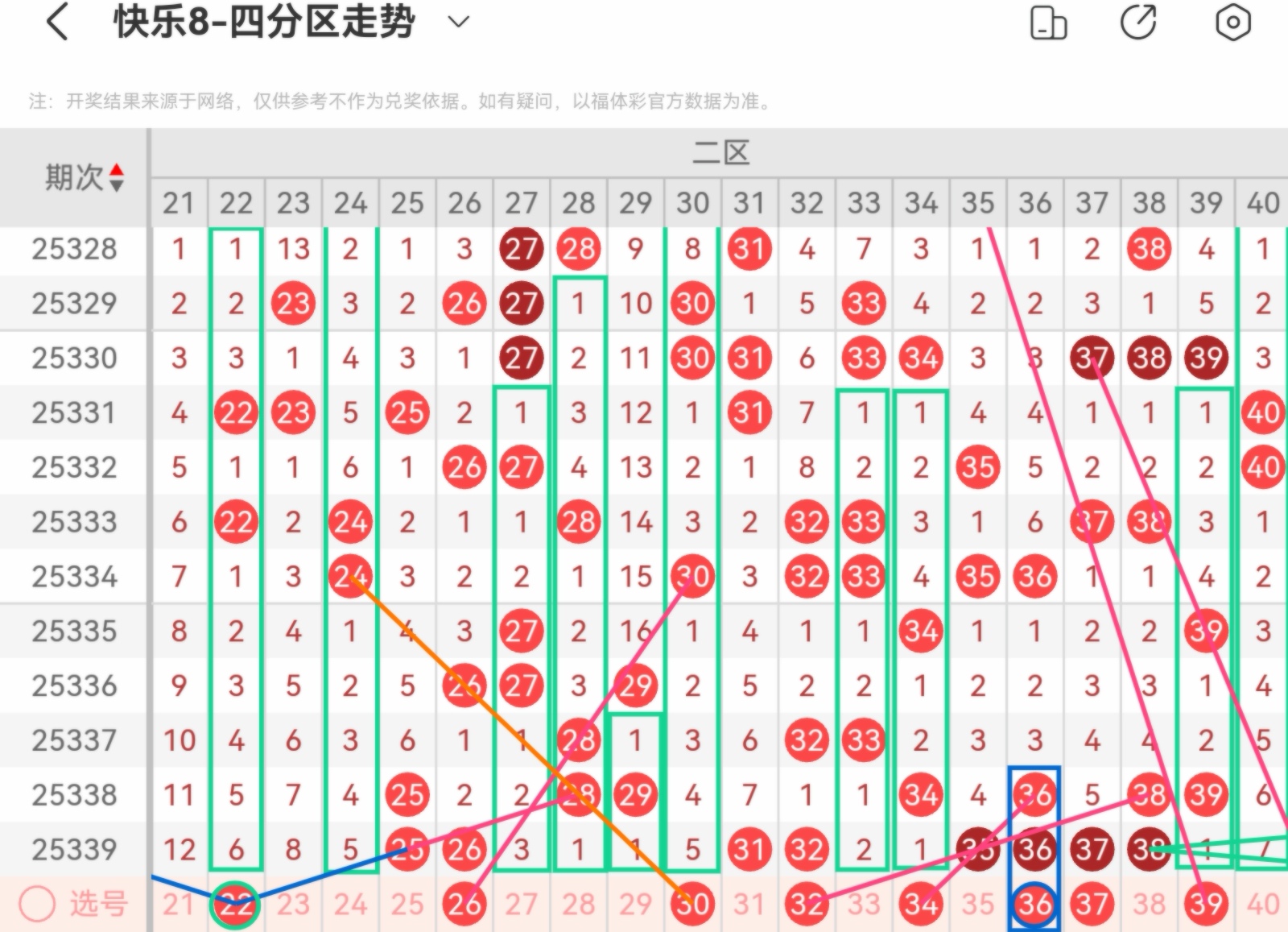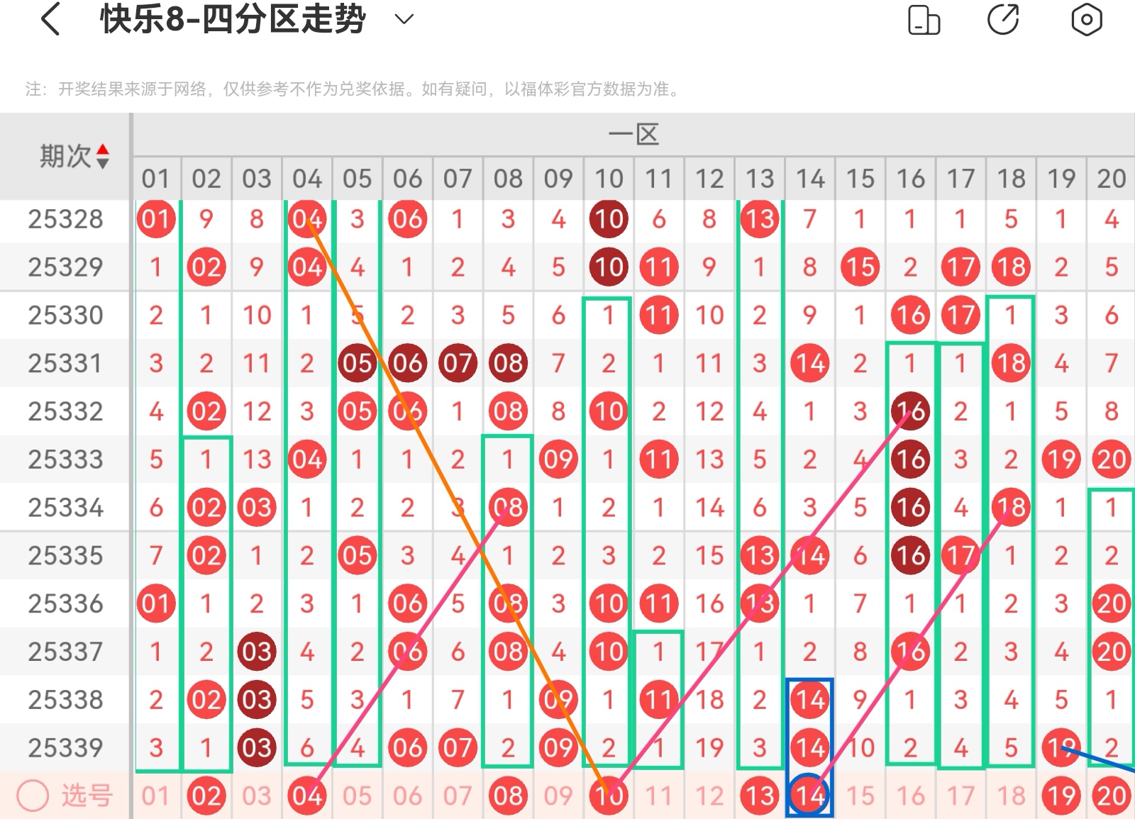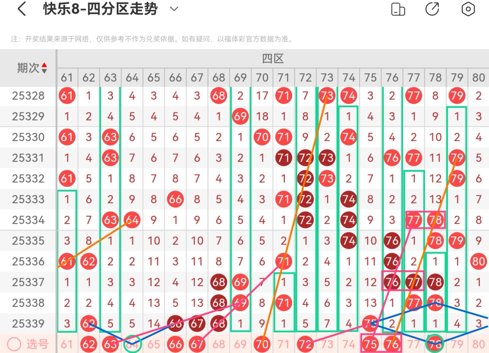 大家好,我是甜丝丝的坏事,主要以快乐八的形态走势、空位走势、遗漏走势以及斜连走势相结合的方法,用公认的四分区走势来进行预测分析,希望能让你有所收获。