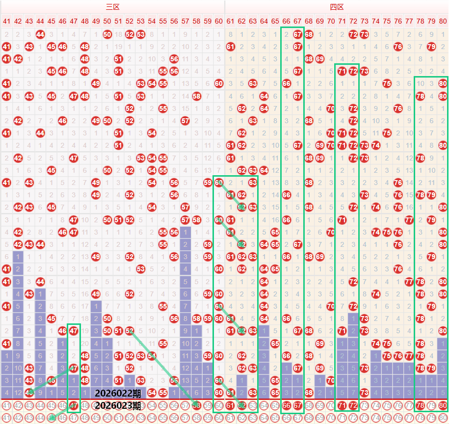 如图所示:在本期大数区的选号中注意在上期的走势中三区间开出了4枚中奖号码,落号数量出现了下滑,至均值以下的水平,目前的三区间落号连续性较差,多出现单期走势,因此本期考虑三区间的落号数量出现继续下滑的走势,本期考虑三区间落位在区间的最低位走势,重点考虑48的重号两边开出号码回补走势,关注47 49的边号形态,尾部位置在上期开出了60 61的三角走势,本期注意58的偶数走势,或者是考虑四区间的62号在近期多次开出60 61 62的斜线走势,四区间上期开出了5枚中奖号码,落位在区间的均值走势,本期注意62的斜线第三期走势,以及61 62的三角延续走势,在上期开出65 68的位置注意夹号二连走势,以及73在上方开出空位走势之后,上期再次开出73之后,本期注意73的边号二连走势,尾部位置注意78 80的偶数双码走势。