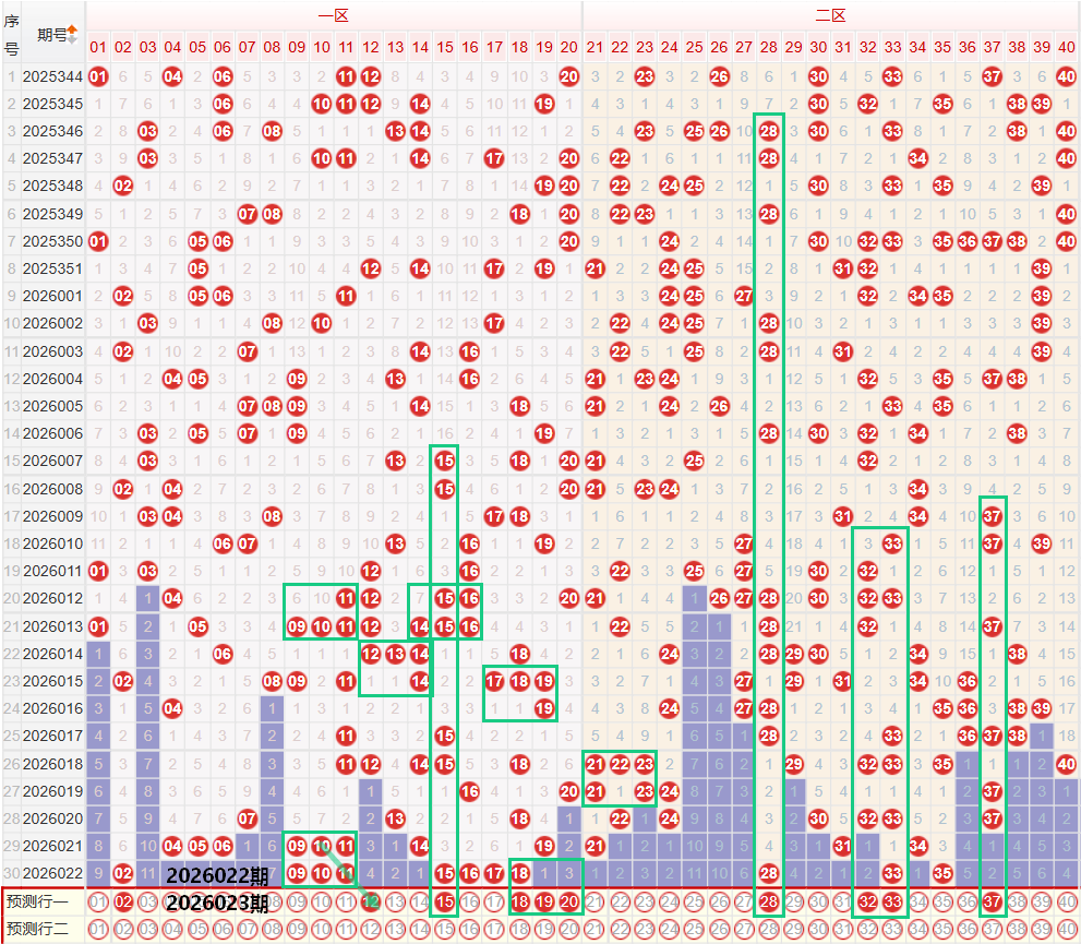 如图所示:在本期小数区的选号中,注意在上期的走势中一区间开出了8枚中奖号码,落位在区间的最高位,目前保持着连续两期的区间最高位走势,上期开出了09 10 11的同步三连重号走势,以及在空位区开出了直四连的走势15 16 17 18,龙头位置开出了02的回补走势,本期注意在上期的开奖结果中,一区间的重号以及连号同时出现,因此本期的一区间继续保持在均值走势以上的可能性还是非常高的,重点关注02的孤码重号走势,以及在上期开出15 16 17 18的位置注意向后延伸连号走势18 19 20,另外需要注意在近期的走势中15的落号形态均为重号形态,在上期15号开出之后,本期要注意15的重号走势,以及12 13 14 15的连号走势,这里主要注意对15 18的重号判断,二区间上期开出了三枚中奖号码,落号数量依旧保持在区间的最低位,在34的位置下方开出了分双边的同步走势33 35,本期注意32或者是36的斜线延续走势,以及28的位置注意重号走势,以及近期较为热门的28 78双码走势,如果考虑32的延续走势,重点关注32 33的二连走势。