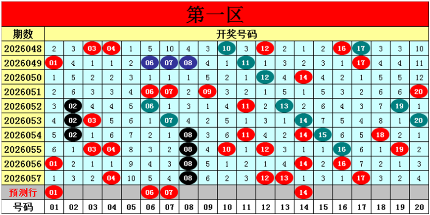 目前第一区包含11个热码:重码5个04、08、12、13、17,邻码3个03、14、16,孤码3个01、10、19;包含8个温码:邻码5个07、09、11、18、20,孤码3个02、06、15;包含1个冷码:邻码1个05,孤码0个;号码冷温热个数比为1:8:11,重号、邻码、孤码个数比为5:9:6。