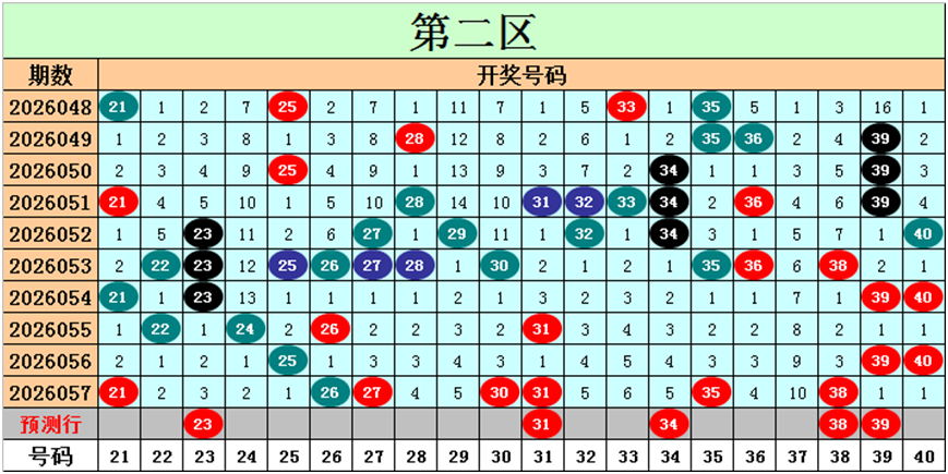 目前第二区包含12个热码:重码7个21、26、27、30、31、35、38,邻码3个22、25、39,孤码2个24、40;包含7个温码:邻码5个28、29、32、34、36,孤码2个23、33;包含1个冷码:邻码1个37,孤码0个;号码冷温热个数比为1:7:12,重号、邻码、孤码个数比为7:9:4。