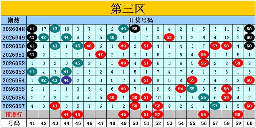 目前第三区包含12个热码:重码5个43、50、52、57、60,邻码4个49、51、56、58,孤码3个48、54、55;包含6个温码:邻码3个42、44、59,孤码3个41、45、47;包含2个冷码:邻码1个53,孤码1个46;号码冷温热个数比为2:6:12,重号、邻码、孤码个数比为5:8:7。