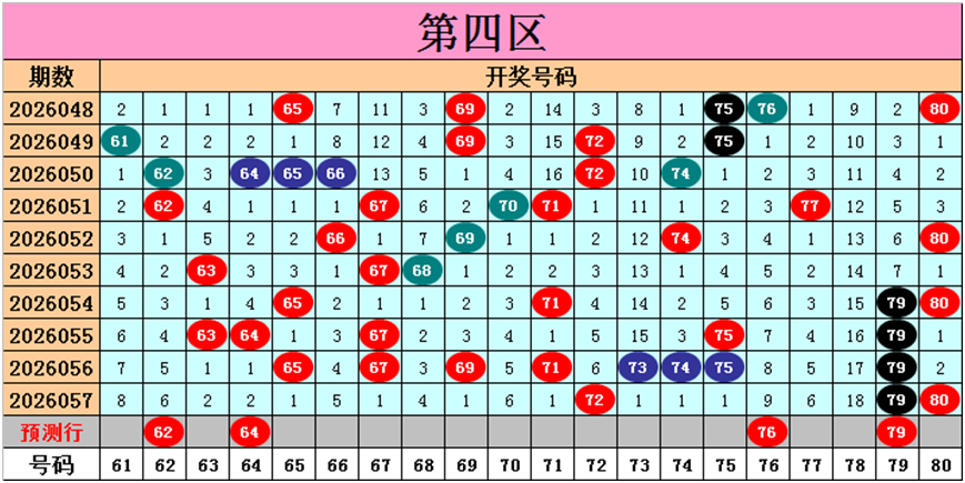 目前第四区包含12个热码:重码3个72、79、80,邻码2个71、73,孤码7个63、64、65、67、69、74、75;包含5个温码:邻码0个,孤码5个62、66、68、70、77;包含3个冷码:邻码2个61、78,孤码1个76;号码冷温热个数比为3:5:12,重号、邻码、孤码个数比为3:4:13。