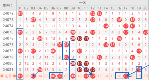 本期的01号数字我们关注一下出号情况,在尾数上是属于斜四连号码,本期出号机会还是很大的。本期的03号数字是属于类型号码,出号机会还是有的,可以关注一下。本期的06 07 08号数字我们注意出一个号码的情况,重点关注一下06 07号数字出号情况。上期开出了10 11 12号数字的三连号,本期我们注意一下出重的情况。本期的16 17号数字我们注意一下出一个号码的情况,重点关注一下17号数字的出号情况。