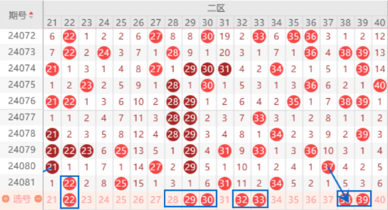 上期开出了22 25号数字,本期我们注意一下出一个重号的情况。本期的28 29 30号数字我们注意一下出一个号码的情况,重点关注一下29 30号数字出一个号码的情况。本期的32 35 38号数字是属于2路号码,断号5期了,本期我们注意一下出一个号码的情况,重点关注一下32 38号数字出一个号码的情况。本期的39号数字我们也是要关注一下出号情况的。