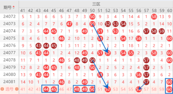 本期的44 45号数字我们注意一下出一个号码的情况,这里的2个号码走势都是很好的,我们选择一个做一下就可以了。本期的48 49 50号数字我们要重点关注一下,这里有可能会出一个两连号的,重点关注一下49 50号数字的出号情况。本期的52号数字注意一下出号情况,属于三斜连对应号码,出号机会还是有的。本期的56号数字我们也是要关注一下的,属于尾数上的跟随号码,出号机会还是有的。本期的60号数字我们还是要注意一下出号情况,属于复制号码。