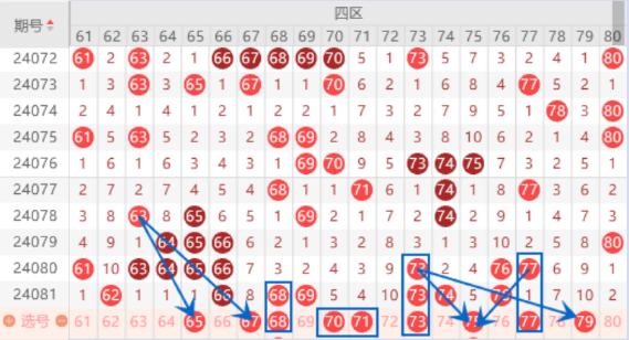 本期的65号数字我们注意一下出号情况,也是属于复制号码,出号机会还是有的。本期的67号数字走的是上一次的走势,本期我们注意一下出号情况。上期开出了66 68 69号数字的连号空一带号,本期我们注意一下出一个重号的情况。重点关注一下68 69号数字出一个重号。本期的70 71号数字我们注意出一个号码的情况。上期73 76号数字都出重了,本期我们防守一下出一个三重的情况就行了。该区间的72 75 78号数字我们注意一下出一个号码的情况,重点关注一下75 78号数字出一个号码的情况。