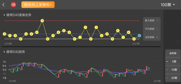今天咱们就继续跟进咱们的第三课,彩虹多多均线分析工具的粘合向下发散形粘合向上发散形。先来看粘合向上发散形,此形态由股票演变而来,出现在上涨的初期,也可以出现在趋势中期。5期,10期,20期均线缠绕粘连后抬头向上,上涨趋势明显。该形态出现后,即可定义为买入时机到来,彩民朋友可对该号码进行关注了。一般粘合缠绕越久,代表后期出现的概率就越大。若持续上涨,信号就越强,成为必选号码。比如本期号码04就符合均线分析中的粘合向上发散形。